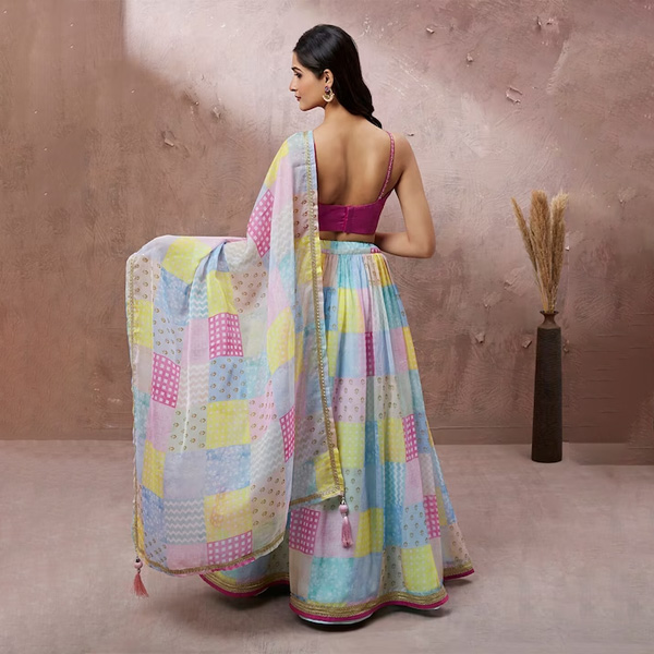 Turquoise blue and pink printed semi-stitched lehenga, has drawstring closure, flared hem,