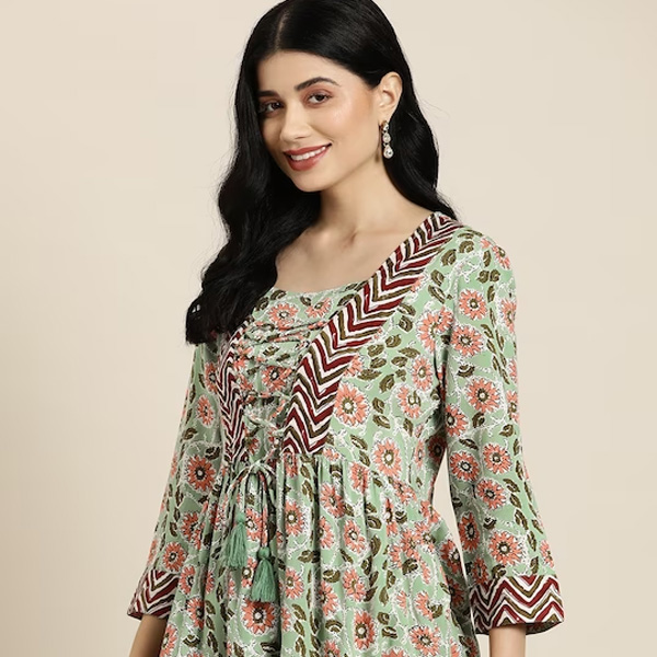 Green and peach-coloured a-line kurti
